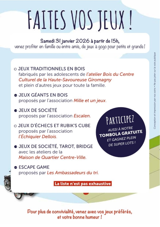 La Maison de Quartier Centre Ville vous invite à son animation "Faites vos jeux" qui se déroulera Samedi 31 Janvier prochain de 15 à 18H, avec un programme d'animations riche et varié comme indiqué sur le flyer ci-joint. Vous pouvez venir avec votre famille, des amis, des voisins...